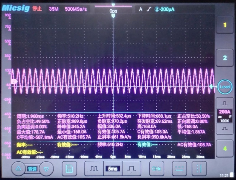 电机额定功率100kW,额定电压380V,额定电流200A,额定转速27000rpm,极对数2对,额定频率900.0Hz,选用我司FD330-132G-4-L02高速驱动器,900Hz半载、载频10.0kHz运行时,输出电流波形如图所示。