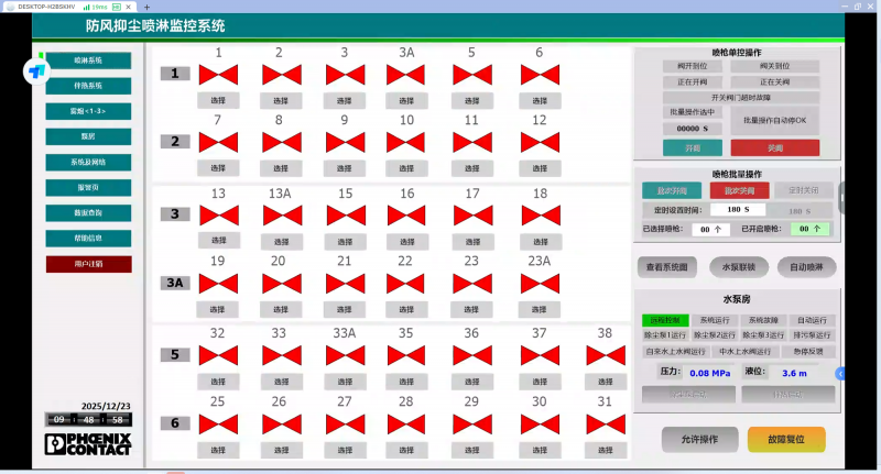 多元控制模式:基于PLCnext开放式生态系统,支持高级语言编程与模型部署特性,平台预留多源数据标准化接入口,能够整合扬尘监测数据、环境气象参数(如风速、湿度)调整喷淋区域、洒水量、洒水时长,实现按需喷淋。