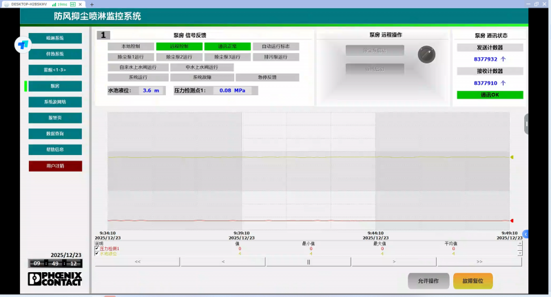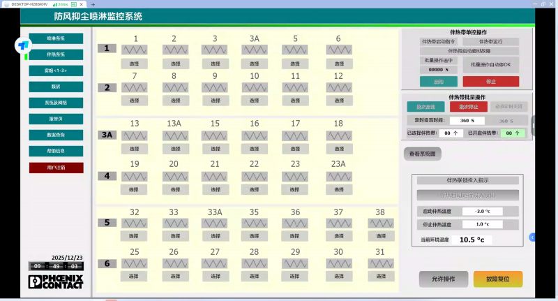 全流程监控与预警:可视化界面直观展示喷枪、伴热带、雾炮及泵房设备的运行状态、压力、液位等数据,通讯异常、设备故障时自动报警,历史数据可追溯,便于快速定位问题;