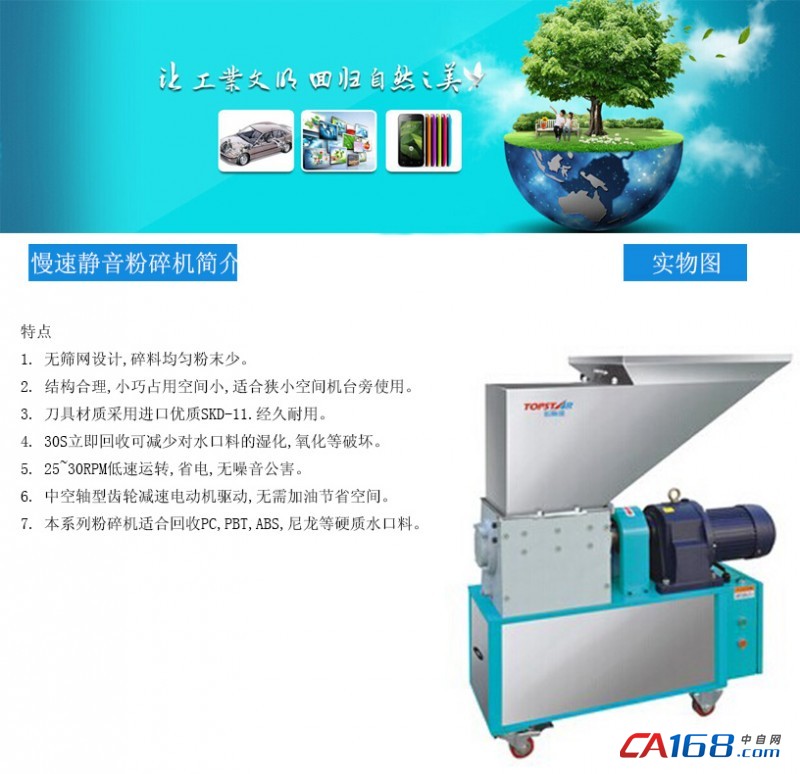 属于无筛网型塑胶回收粉碎机。 25~30rpm低速运转,齿啃式刀具设计,专门设计用于粉碎各类硬性及易脆塑胶之不良产品,次品的机边粉碎回收利用;尤其适合粉碎回收PC、尼龙、ABS等硬质水口料。具有转速低,扭矩大,噪音低,产生粉尘少,操作简便的优点,而且具备产品粉碎颗粒均匀,粉碎效果极佳,设备运转中无过热现象,使用寿命长等特点。